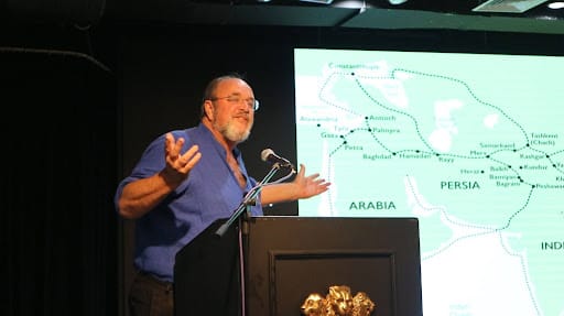 Sebagai pembicara utama, William Dalrymple kemudian mengulas gagasan “Jalur Sutra” yang populer sekaligus membandingkannya dengan jaringan rute maritim yang menghubungkan India dan Asia Tenggara. William menegaskan bahwa jaringan maritim menjadi jalur utama penyebaran agama Buddha, arsitektur, sistem angka, hingga estetika seni dari India ke Asia Tenggara membentuk karakter budaya yang kini dianggap khas dari kawasan tersebut. Ia juga menampilkan contoh perbandingan arsitektur yang menunjukkan bagaimana elemen-elemen yang berakar dari India berkembang menjadi bentuk-bentuk baru yang khas Asia Tenggara.