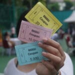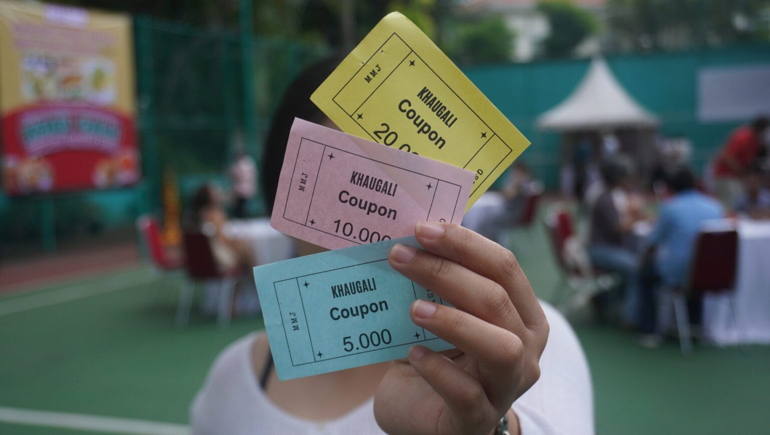 Pengunjung menunjukan kupon uang yang digunakan untuk melakukan transaksi pada festival Khau Galli di India House, Menteng, Jakarta, Minggu (4/5/2025). Foto: India News Desk/Rafi Fadhilah