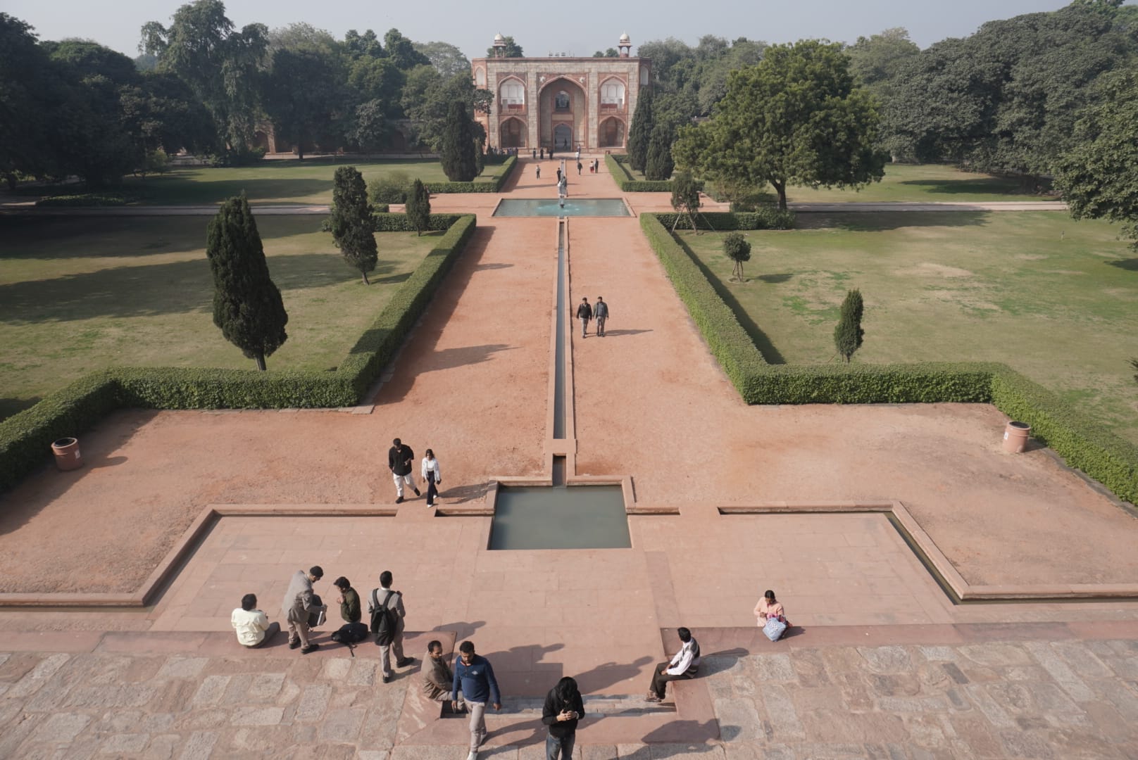 Humayun’s Tomb dibangun pada 1570 atas perintah Permaisuri Haji Begum untuk mengenang Kaisar Humayun, penguasa kedua Dinasti Mughal. Begitu memasuki area kompleks, pengunjung langsung disambut tata taman simetris bergaya Persia yang dikenal sebagai charbagh. Jalur pejalan kaki, kolam air, dan hamparan rumput tersusun rapi, menciptakan suasana yang kontras dengan hiruk-pikuk New Delhi di luar pagar kompleks.